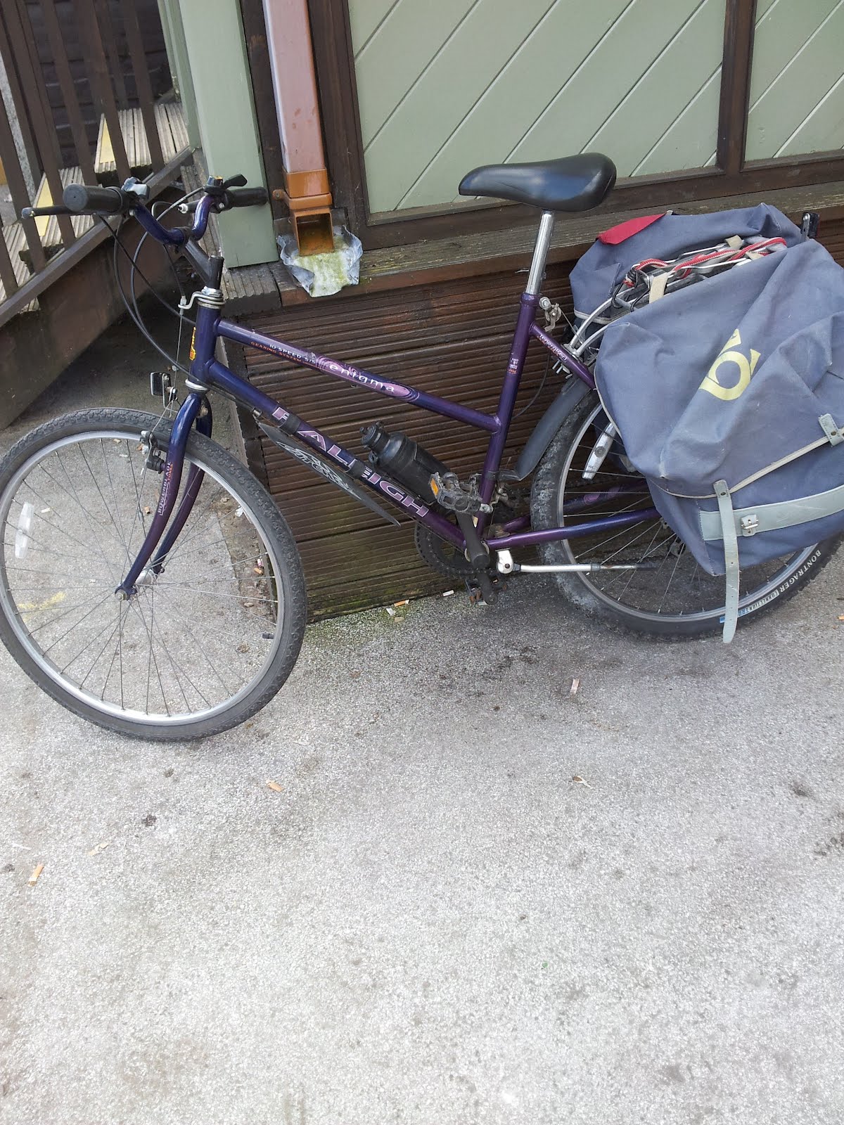 Dette er altså min sykkel i England, kjøpt i England for ca 17 år siden - still going - og siden jeg synes det går litt tungt innimellom, så veide jeg sykkelveskene mine, og jammen veide de 18 kg !! Ikke rart jeg synes det var tungt !! Men vi sykler hele tida fra sted til sted, uten å legge opp rute på forhånd, så vi må ha alt med oss til enhver tid. (Og ikke er det 'racerdekk' heller !!). Men jeg vil heller svette på en sykkel, enn å svette på en badestrand, til forskjell fra mange andre.